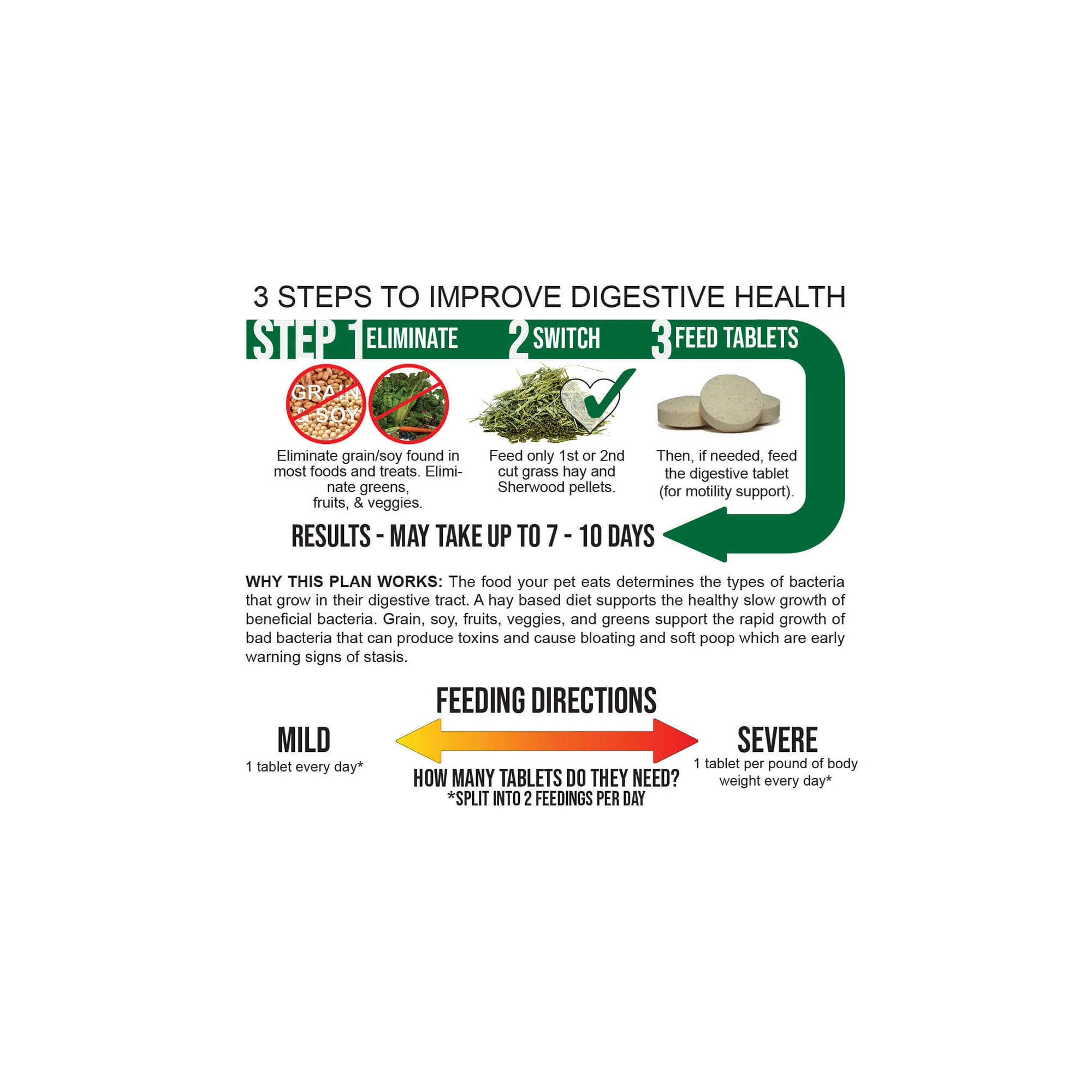 Results and Rationale: The strategy aims to balance digestive bacteria by supporting slow beneficial bacterial growth while limiting fast detrimental ones. It could take up to 7-10 days before any changes are noticed.