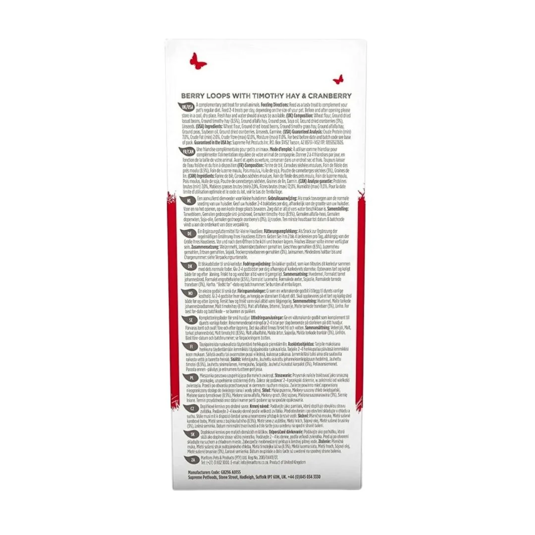 Indulge your small furry pets with Selective Naturals Berry Loops, a delectable treat made with Cranberry and Timothy Hay. Crafted in Supreme Pet Foods Suffolk bakery, these baked treats are high in fiber and free of added sugar, making them an ideal choice for small pet herbivores.